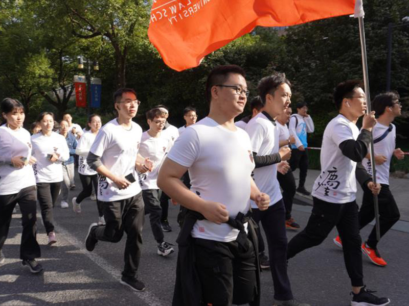 开幕式结束,随着“出发”的号令,光华法学院的同学们在吴卫华老师的带领下开始了阳光长跑。宋焕韬同学领着光华法学院的院旗跑在队伍最前,法学院的学子们紧随其后,步伐整齐轻快地跑过田径场,穿过迪臣路,用步伐丈量熟悉的校园。汗水渐渐浸透了他们身上的院衫,但他们望向前方的眼神和迈向前方的步伐依然坚定。