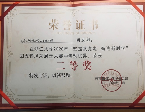 2020年12月6日,浙江大学2020年“坚定跟党走 奋进新时代”团支部风采展示大赛校级决赛在紫金港校区临水报告厅举行。校党校办公室副主任郭彪、校团委副书记(兼职)盛羽、地球科学学院团委书记鲍雨欣、农学院团委书记邱慧出席活动并担任嘉宾评委,曾带领团支部获2019年省高校十佳风采团支部荣誉的电气工程学院爱迪生实验班团支部书记麻航翔受邀参与评审,全校新任团支部书记、新任校院两级兼职团干部共计400余人观赛学习。浙江大学光华法学院法学1802团支部荣获浙江大学2020年“坚定跟党走,奋进新时代”团支部风采展示大赛二等奖。