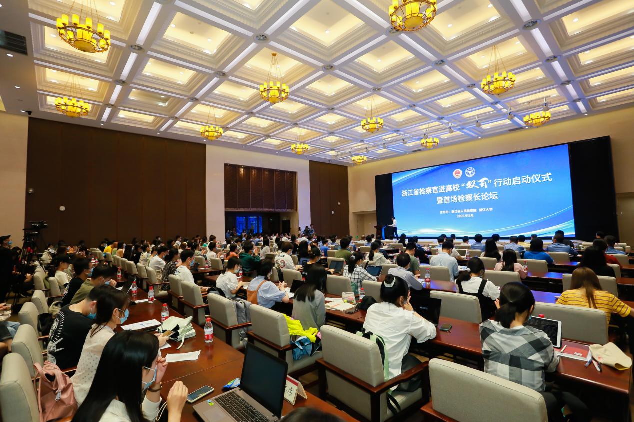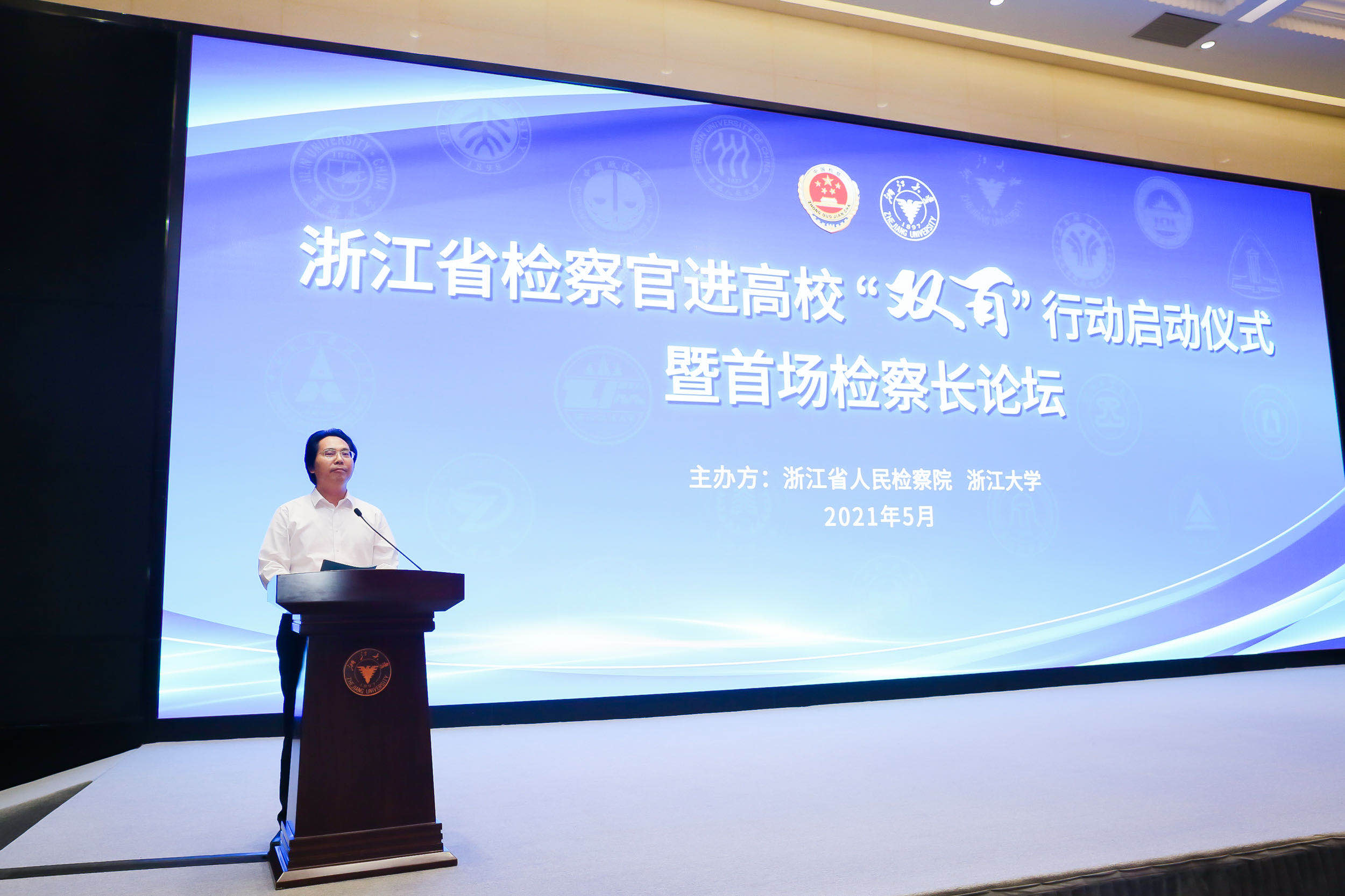 2021年5月29日下午,浙江省检察官进高校“双百”行动启动仪式暨首场检察长论坛在浙江大学紫金港校区求是大讲堂举行。浙江省人民检察院党组书记、检察长贾宇致辞并宣布“双百”行动启动,浙江大学党委书记任少波、省教育厅厅长陈根芳分别致辞。浙江大学副校长黄先海主持仪式。