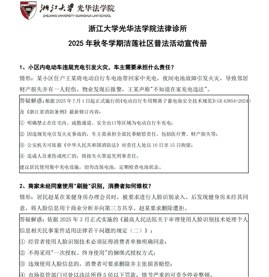 12月5日,浙江大学光华法学院修读《法律诊所》课程的十余名本科生,在课程教师指导下,联合社区居委会,借助志愿者活动日的契机,开展基层普法活动,将专业法律知识转化为触手可及的民生服务,用实践诠释新时代法学教育的温度与担当。