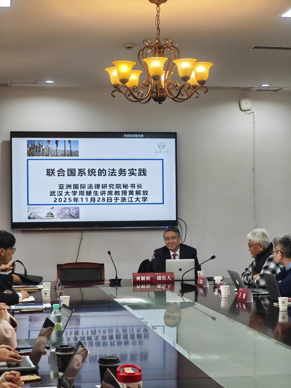 2025年11月28日,浙江大学光华法学院八十周年院庆系列活动:国际法与涉外法治沙龙第十一期在光华法学院五号楼206室举办。亚洲国际法律研究院秘书长、武汉大学周鲠生讲席教授黄解放受邀主讲“联合国系统的法务实践”专题讲座,本次论坛由浙江大学求是特聘教授、浙江大学求是学院常务副院长赵骏主持,浙江大学文科资深教授、浙江大学国际战略与法律研究院院长、欧洲科学院院士王贵国,浙江大学光华法学院副院长、教授陆青,浙江大学光华法学院“百人计划”研究员王森,浙江大学光华法学院“百人计划”研究员段文,长沙理工大学法学院副教授王寰参与了此次论坛。